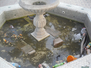 Above: One of the Palm-lined boulevards in the new medina - quite trendy. Below: Inside the fountain - quite trashy.