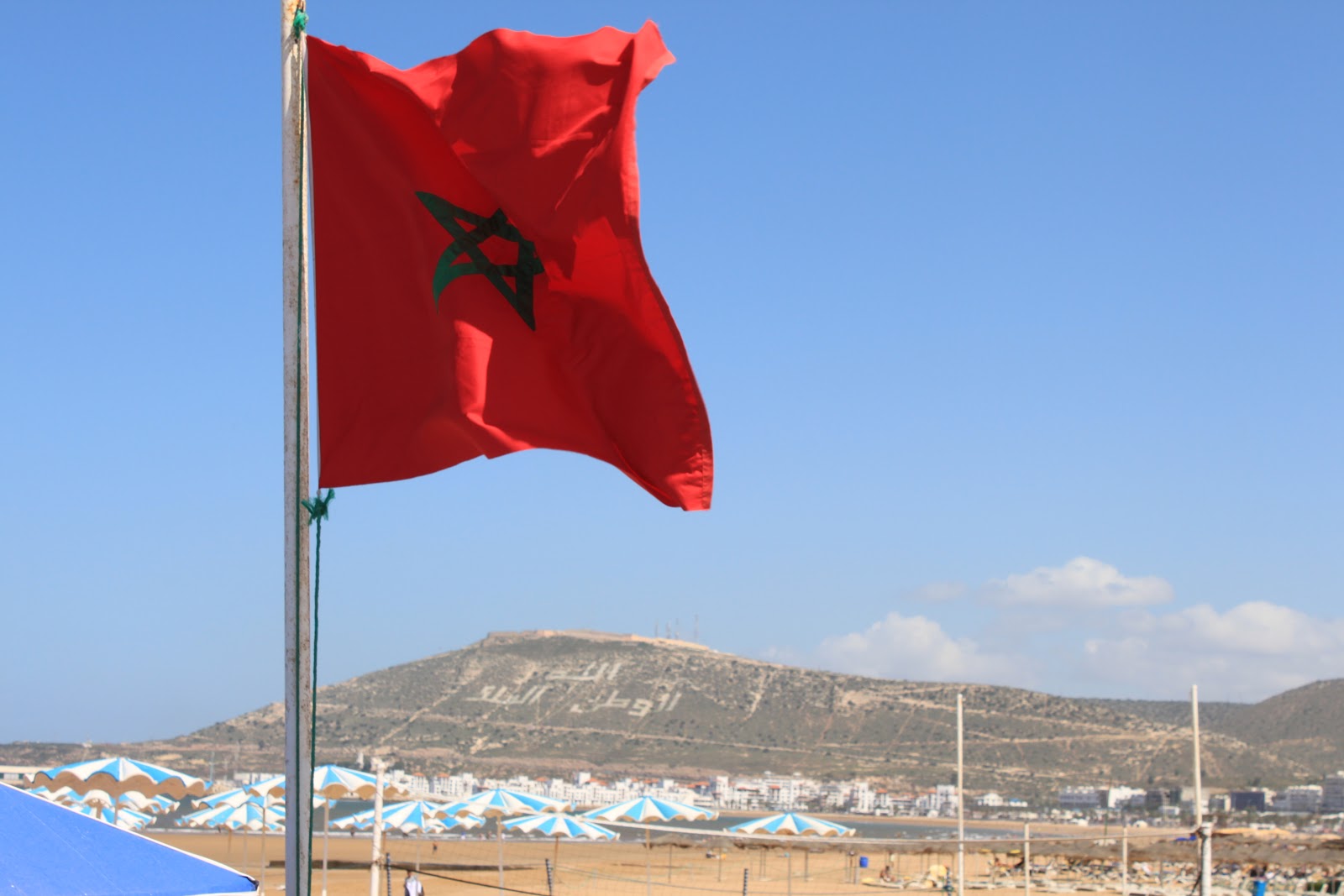 The Moroccan Flag flying along Agadir's coast and, in this picture, over the mountainous Oufalla in the distance. Between the hilltop and the beach is written, "God, Country, King."