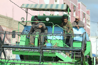 Mom: "The upside [of the trip] came when we were on the final leg of the journey through the oasis filled stretches after our descent from the highest of the ranges. Filled with exotic palms, swaths of rich green bamboo, small grids of farm crops (obviously melons and other water demanding plantings) and native shrubs filled with pink, lavender and fuchsia blooms, the river supplied a diverse range of horticultural life - my reward for surviving my earlier torture!"