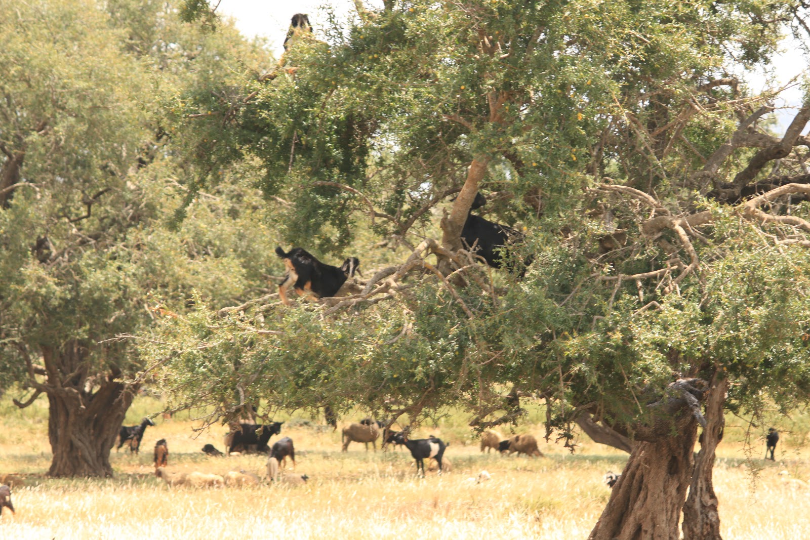 The Goats crack the harder, outer shells of the Argon Fruit, exposing their oil-filled interior for harvest.