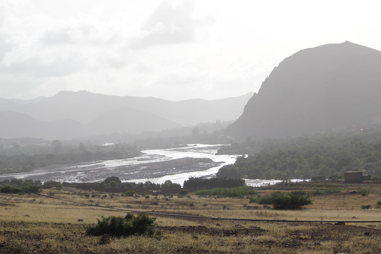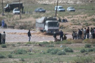 We winded around the corner to find cars and trucks idling along the road's side, split by a seemingly insurmountable obstacle. Between them, a forty meter deluge of brown water flooded over the road's spillway into the valley rocks on the other side. The same image undoubtedly ran through each traveler's head: the torrent pushing his vehicle off the road into those rocks. Unfortunately for us, there was no way around the spillway; either we cross it or go back 150 minutes toward Agdz.